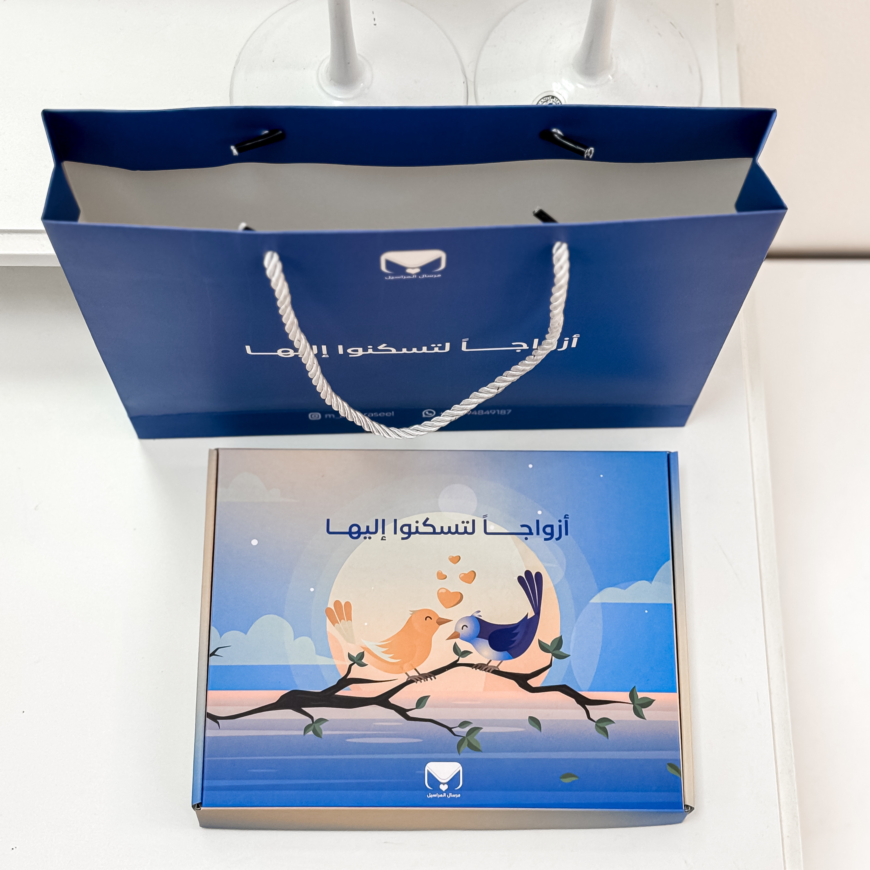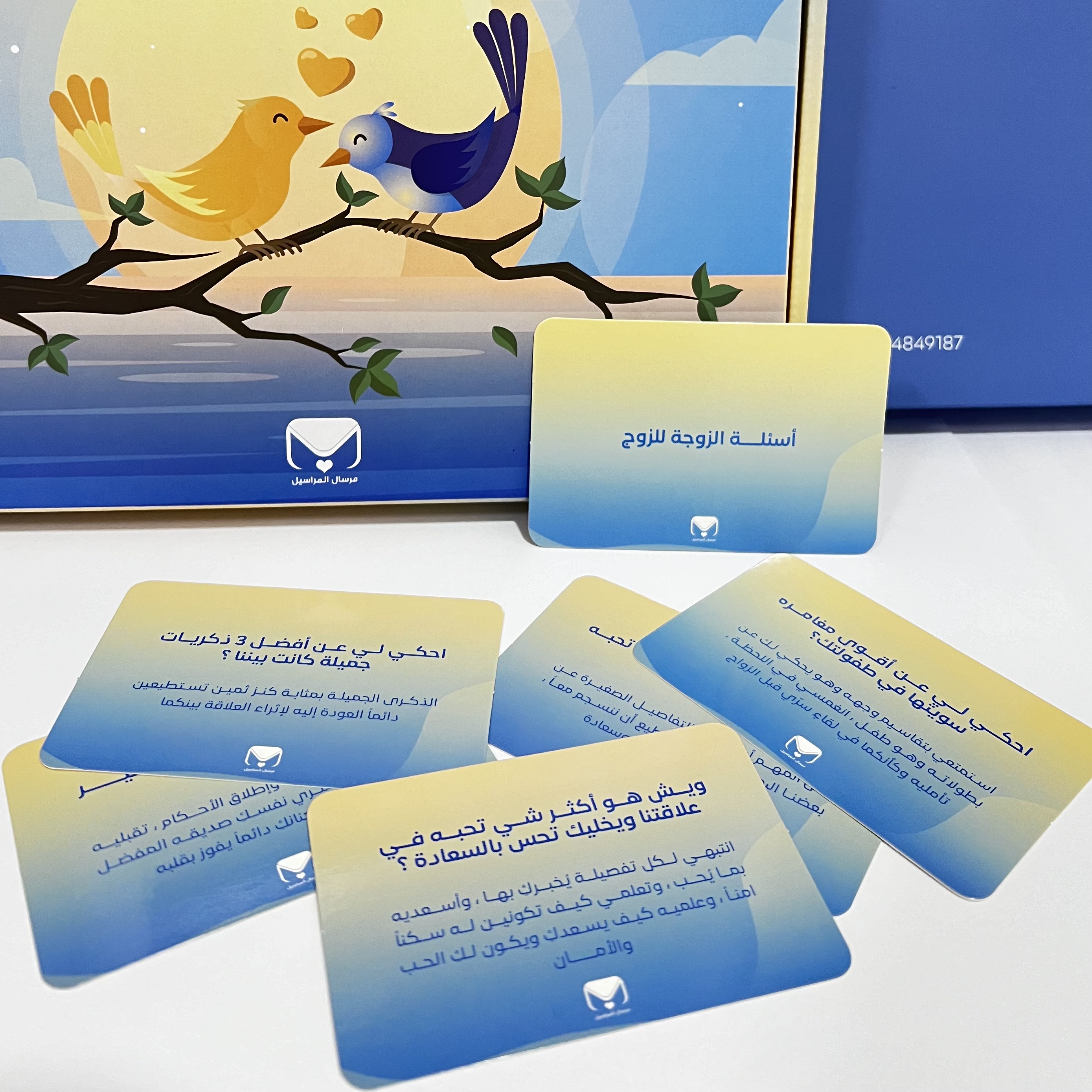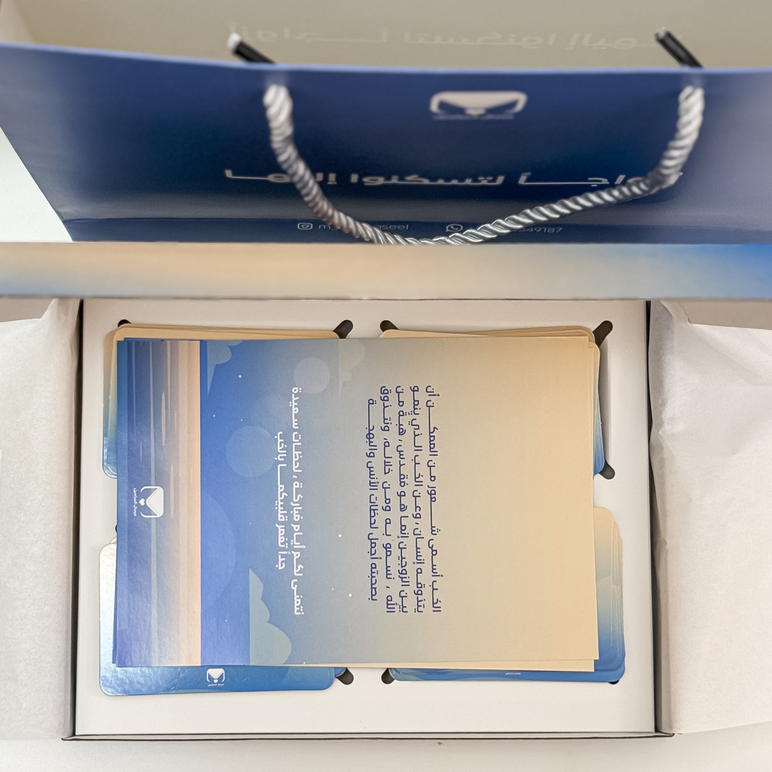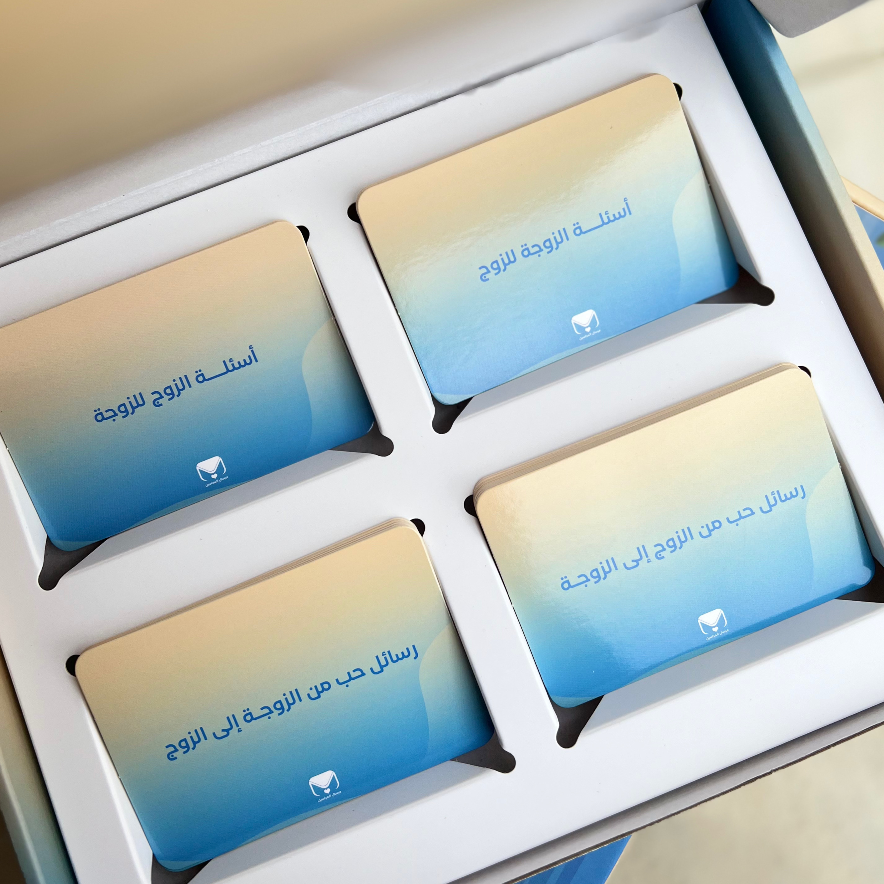 متى آخر مره قلتي لـ زوجك "أحبك" بطريقة جديدة ما تخطر على باله؟ كيف ممكن تكوني أنثى بكامل أحاسيسك وتسمحي لـ زوجك يذوب فيك؟ هل حاسه إنه في مسافة مزعجة بينك وبينه وصار صعب عليك تجاوزها؟ يا ترى لو عشتي معه الانسجام وصارت علاقتكم دافيه لأبعد حد كيف راح يكون شعورك؟ صممت هذا البوكس حتى أساعد كل زوجين يهربوا من زحمة الحياة والمسؤوليات ويغوصوا مع بعض في أعماق بحر الحُب اللي بينهم .. الأسئلة تفتح باب الحوار وقبلها تفتح باب القلب، مكتوبة بطريقة تساعد كل واحد من الزوجين يعبر عن اللي بداخله بكل أريحية .. ويش أحلى من إنه زوجك يكون صندوقك السري وزوجتك تكون مخبأ أسرارك؟ ما أظن في شعور ألذ من كذا .. أما رسائل الحُب الـ ٢٠ فـ كتبتها من أعمق نقطة بقلبي وأنا متزوجه وأعرف تماماً ويش يعني إنه الرجُل يحتاج يشعر بالتقدير وويش يعني إنه المرأة تحس بالأمان مع زوجها .. الرسائل بمثابة جرعات من الحُب تقدري تتبادليها معه في أوقات متفرقه، في أوقات انتي بذكائك الأنثوي تقدري تعرفي أي رسالة زوجك محتاج توصله منك اليوم؟ ويا سلام لو خليتيها عادة وسجلتي له الكلمات بـ صوتك وهو بعيد عنك أياً كان مشواره، صدقيني راح يرجع لك لهفته بقلبه ولمعة الحُب والامتنان بعيونه. وفي بعد بالبوكس ورقة نوايا أنا شخصياً شفت بركة النوايا بزواجي الحمدلله وحبيت إنك تستفيدي كذلك، النوايا مثل البذرة اللي تخبيها بالأرض ومع الوقت تلاقي نفسك عايشه تحت ظل شجره وارفه تظللك بالحب والسعادة. أما النوته الفاضيه فـ استخدميها بالطريقة اللي تشبهكم، ممكن تحطيها في مكان بارز بالغرفة وبين الوقت والثاني كل واحد يكتب للثاني رسالة، كلمة، عتب، اعتذار، اشتياق، أي شي يخطر بالقلب .. إذا حاسه إنه شجرة الحب اللي بينكم محتاجه ماي يرويها فـ هذا البوكس صار وقته تستخدميه الحين، ضيفيه للسلة وبشريني بالمشاعر الحلوة اللي عشتوها معه 🥹💗