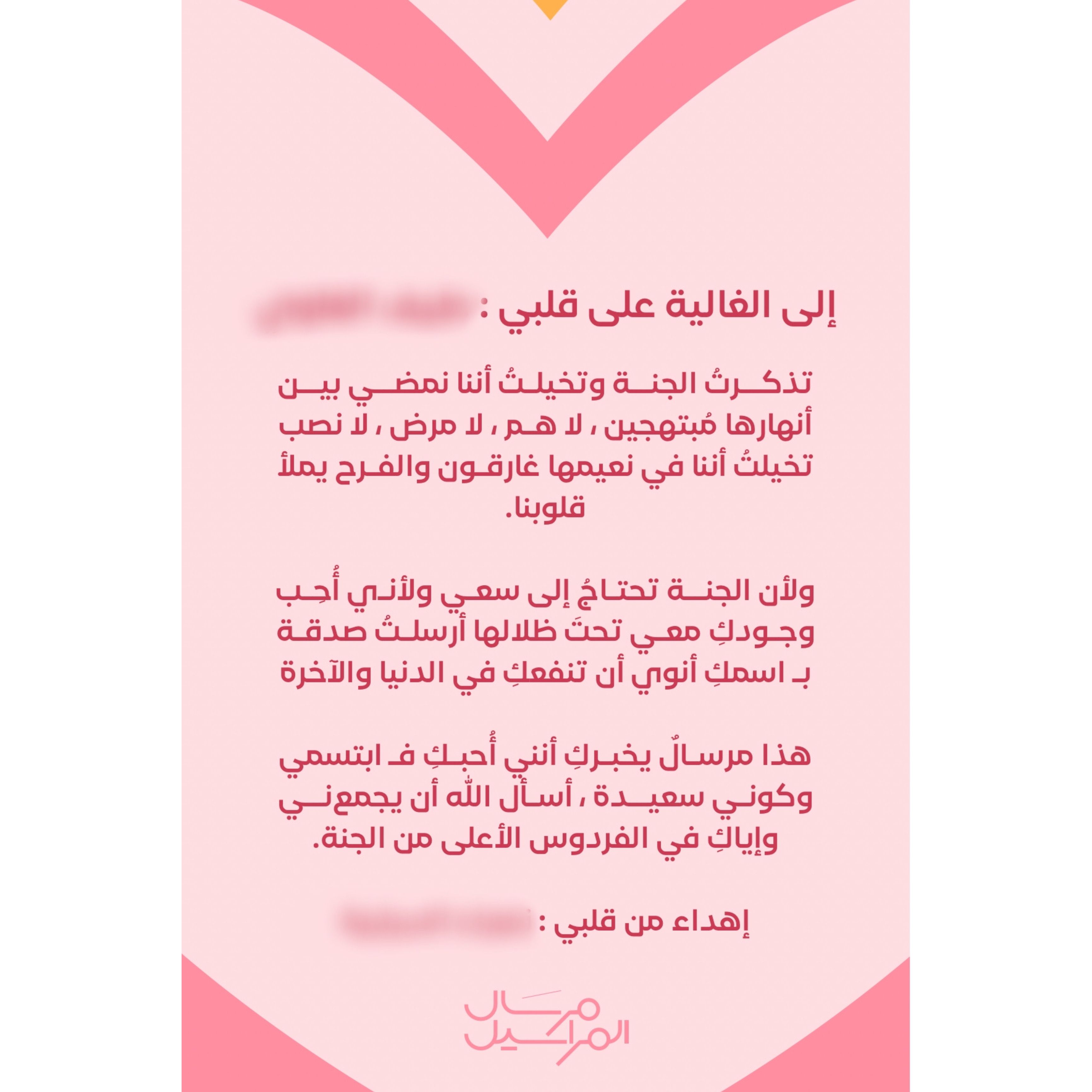 الفكرة عبارة عن رسالة بكلمات تلامس القلب تختار الأشخاص اللي بخاطرك تهديهم ونرسل لهم الاهداء بأسماءهم واسمك. نرسل مبلغ الصدقة لـ جمعية دار العطاء